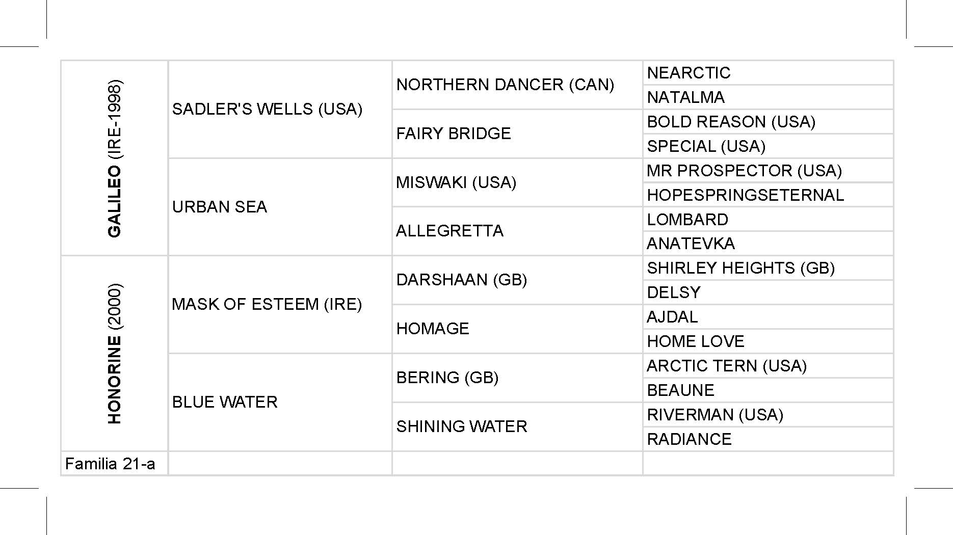 GALILEO (IRE), “Campeón 3 Años” en Europa en 2001, ganador de 6 carreras en Inglaterra e Irlanda, incl. Irish Derby (IRE-1), King Geo 6th Queen Elizabeth Diamond Stakes (ENG-1), Vodafone Derby (ENG-1), Derby Trial Stakes (IRE-3), Ballysax Stakes (IRE), 2do. Irish Champion Stakes (IRE-1). Es padre de: NEW APPROACH (IRE-1.- Padrillo), RIP VAN WINKLE (IRE-1) CAPE BLANCO (IRE-1), FRANKEL (ENG-1), CIMA DE TRIOMPHE (IRE-1), RODERIC O’CONNOR (FR-1), MISTY FORME (IRE-1), SANS FRONTIERES (IRE-1), LILY OF THE VALLEY (FR-1), SOLDIER OF FORTUNE (IRE-1), TEOFILO (ENG-1.- Padrillo.), RED ROCKS (USA-1), SIXTIES ICON (ENG-1.- Padrillo), ALANDI (IRE-1), LUSH LASHES (ENG-1), NIGHTIME (IRE-1), ALLEGRETTO (ENG-1), MAHBOOBA (AUS-1), SOUSA (NZ-1), KITE WOOD (FR-2), MIDAS TOUCH (IRE-2), INCANTO DREAM (FR-2), VENDANGEUR (IRE-2), GALLANT TESS (AUS-2) LINTON (AUS-2), AGE OF AQUARIUS (IRE-3), MIKHAIL GLINKA (ENG-3), TOGETHER (IRE-3), DRESS REHEARSAL (IRE-3), OH GOODNESS ME (IRE-3), SEVENNA (IRE-3), SOUTH EASTER (ENG-3), ADORED (IRE-3), CUIS GHAIRE (IRE-3), GRAVITATION (ENG-3), PRIMA LUCE (IRE-3), MAHLER (ENG-3), HELIOSTATIC (IRE-3.- Padrillo.), etc.
